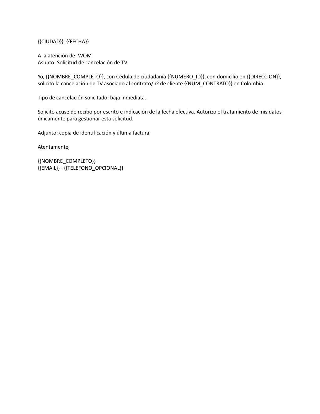 La cancelación de Wom TV en Colombia es un proceso diseñado para aquellos usuarios que requieren una baja inmediata de su servicio. Este modelo de cancelación resulta útil en situaciones donde se desea dar por terminado el contrato sin esperar el plazo habitual. Al utilizar este proceso, el usuario deja constancia por escrito de su solicitud, asegurando que su petición sea registrada oficialmente. Es fundamental seguir los pasos indicados y utilizar los canales correctos para garantizar que la cancelación sea efectiva y sin contratiempos, evitando así posibles cargos adicionales en el futuro. A continuación, se detallan los requisitos necesarios para llevar a cabo este procedimiento.