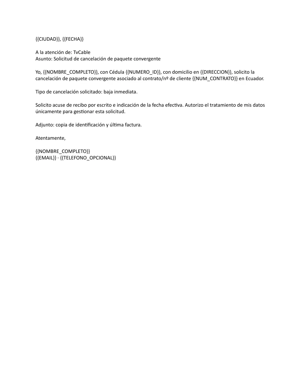 La cancelación del paquete convergente de TV Cable en Ecuador es un proceso que permite a los usuarios discontinuar sus servicios de telecomunicaciones de forma efectiva y rápida. Este modelo es útil para quienes requieren una baja inmediata, ya sea por motivos de insatisfacción, cambios de residencia o cuestiones financieras. Al completar este trámite, el usuario deja constancia por escrito de su decisión, lo que garantiza un seguimiento adecuado de la solicitud. Es fundamental entender los procedimientos y requisitos para llevar a cabo esta gestión de manera correcta, evitando así complicaciones y asegurando que se respeten los derechos del consumidor en todo momento.