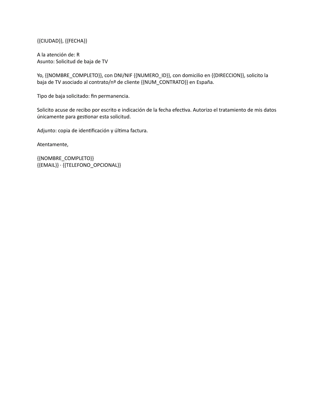 La baja del servicio de R TV en España permite a los usuarios dar por finalizada su relación contractual una vez concluido el período de permanencia. Este modelo de baja es útil para aquellos que desean cambiar de proveedor o simplemente dejar de utilizar el servicio. Al tramitar la baja, se establece un registro por escrito que garantiza la formalización del proceso, evitando inconvenientes futuros. Es fundamental que los usuarios conozcan este procedimiento para no enfrentarse a cargos imprevistos y asegurar que la baja se lleva a cabo de manera correcta y efectiva. Así, el modelo de baja se convierte en una herramienta esencial para gestionar esta transición de forma adecuada.