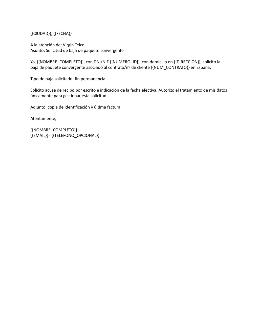 Baja de Virgin Telco Paquete Convergente Fin de Permanencia Word/PDF