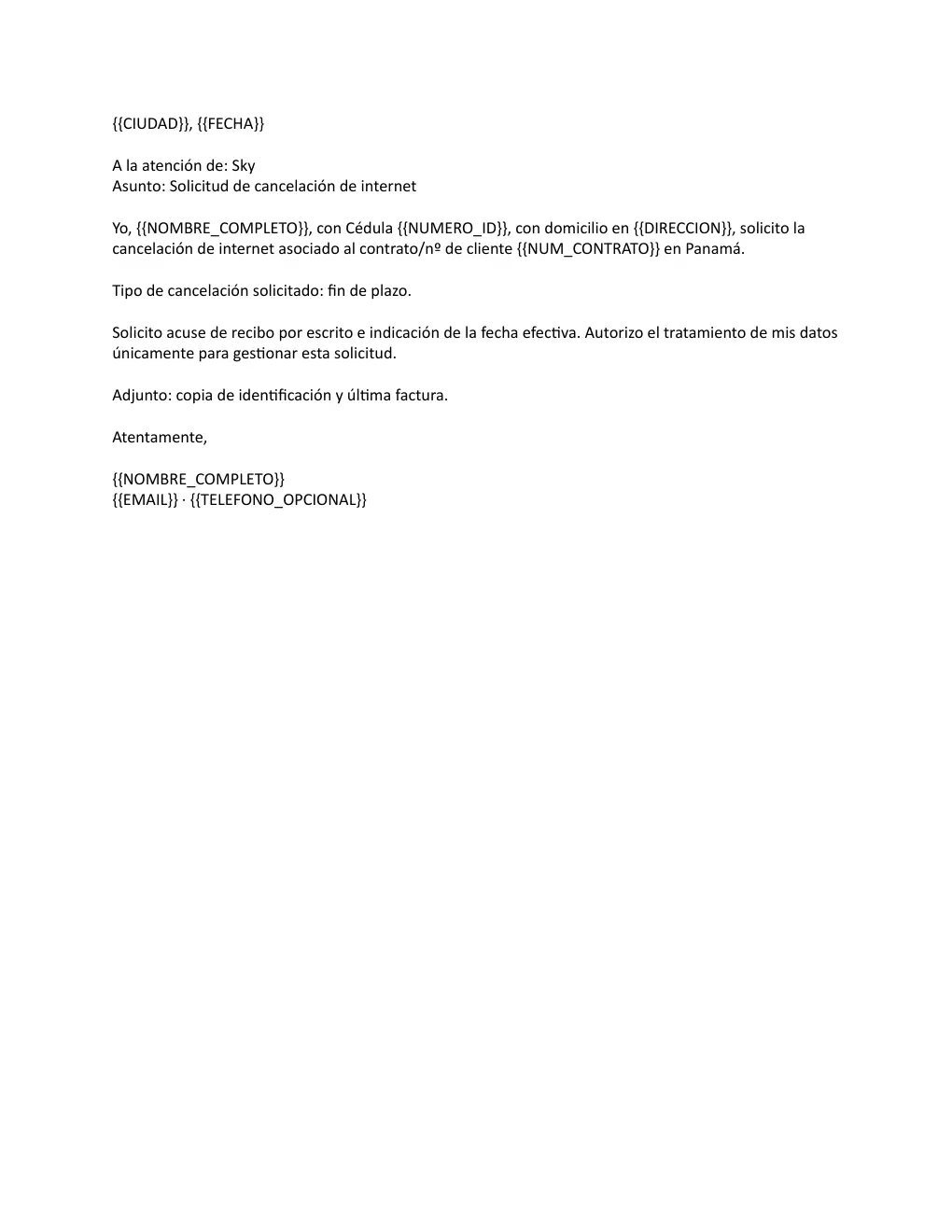La cancelación de Sky Internet en Panamá se vuelve necesaria cuando el contrato llega a su fin. Este modelo de cancelación es útil para los usuarios que desean dejar constancia por escrito de su intención de finalizar el servicio tras el cumplimiento del plazo acordado. Es un procedimiento recomendado en situaciones donde se requiere formalizar la baja del servicio, asegurando que se sigan los pasos adecuados para evitar inconvenientes. Al realizar una cancelación de este tipo, los usuarios se protegen y pueden gestionar su servicio de manera efectiva, cumpliendo con los requisitos y protocolos establecidos por la empresa.