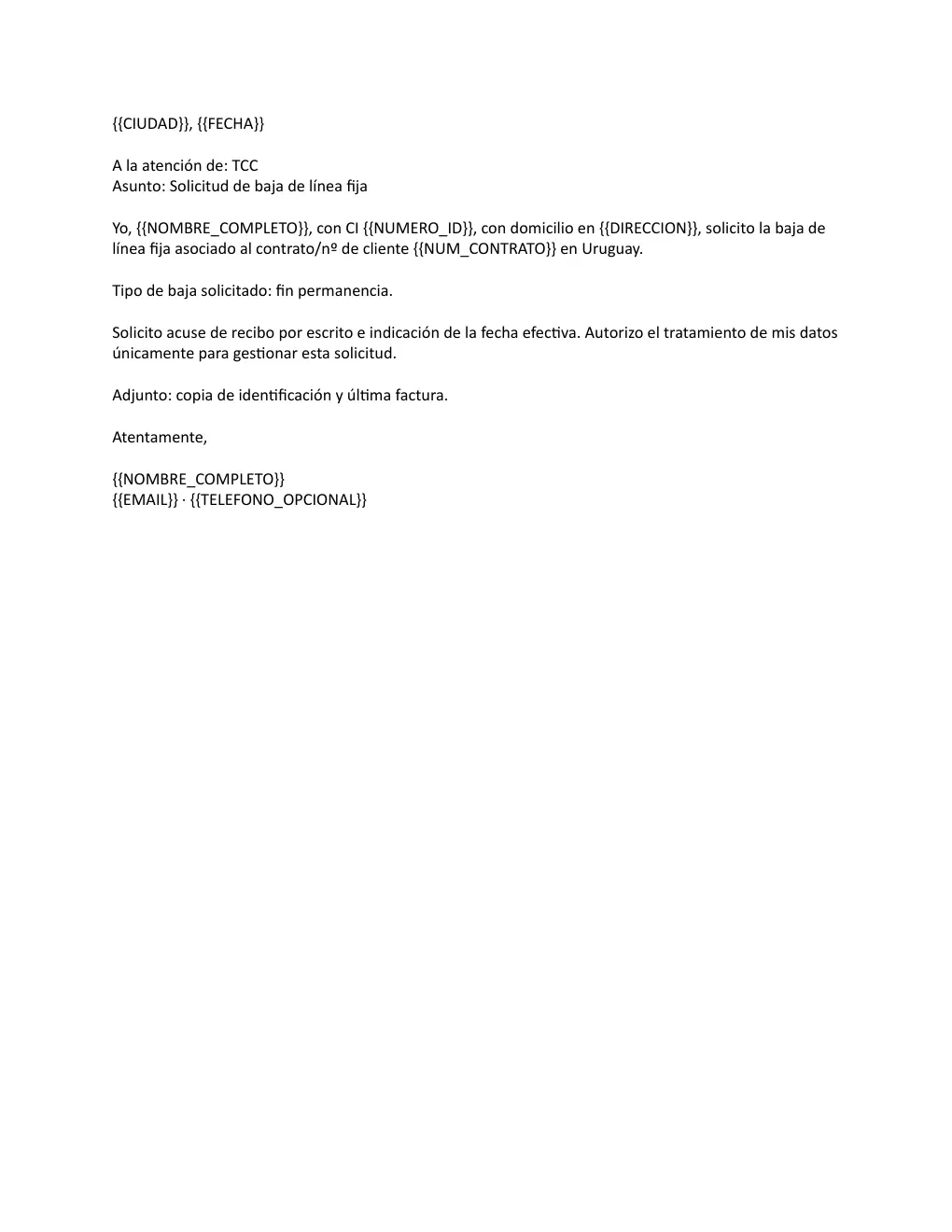 Modelo de baja TCC línea fija fin permanencia Word/PDF